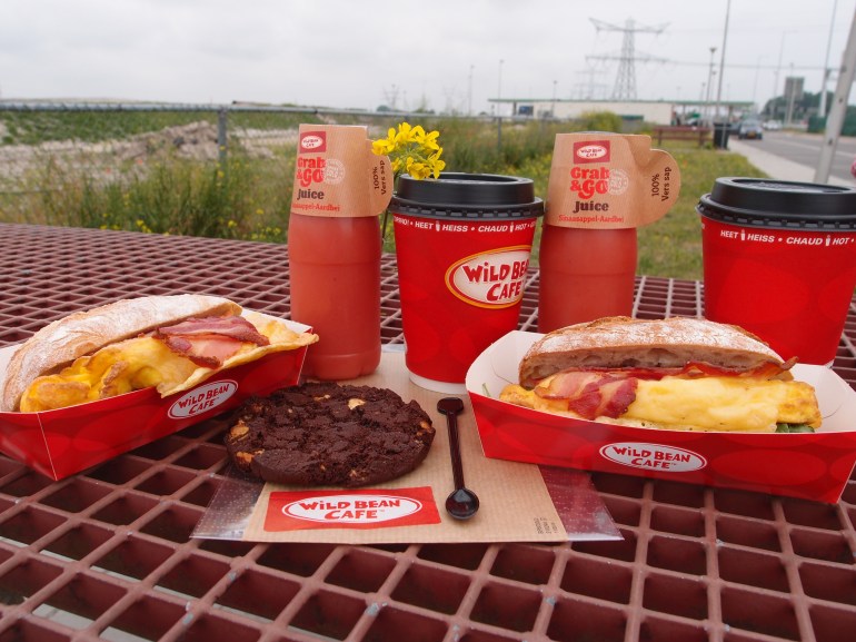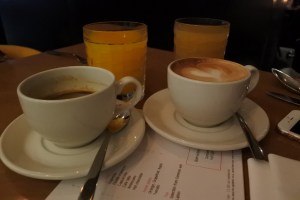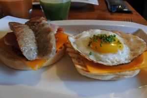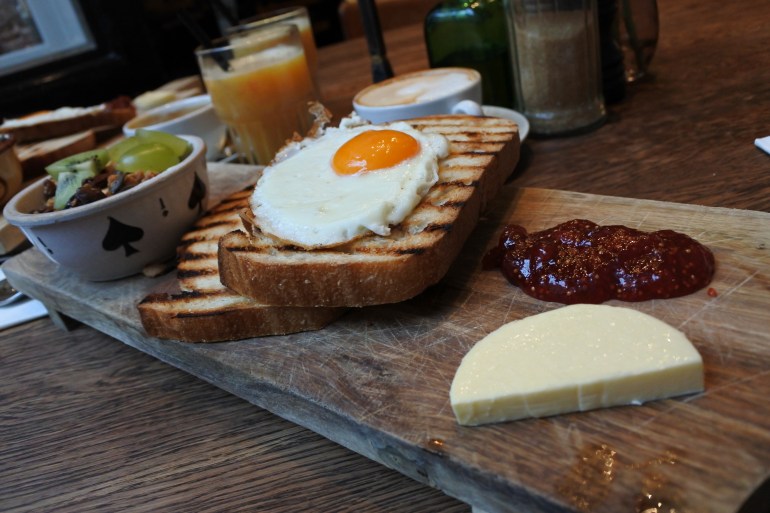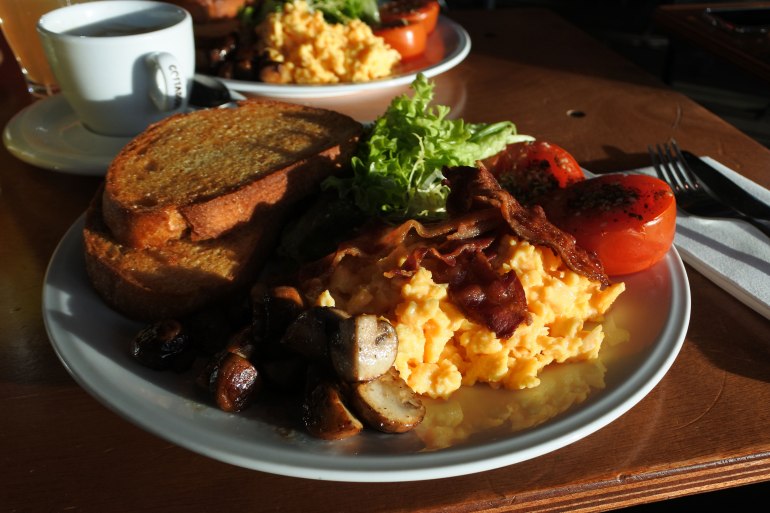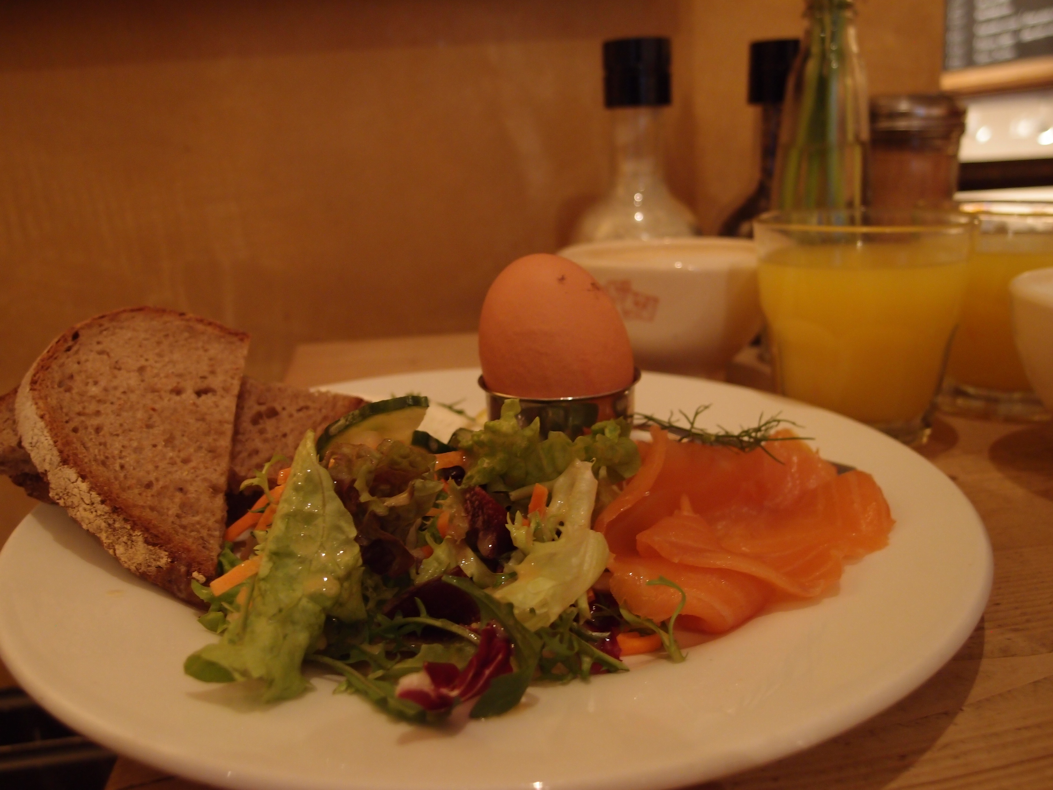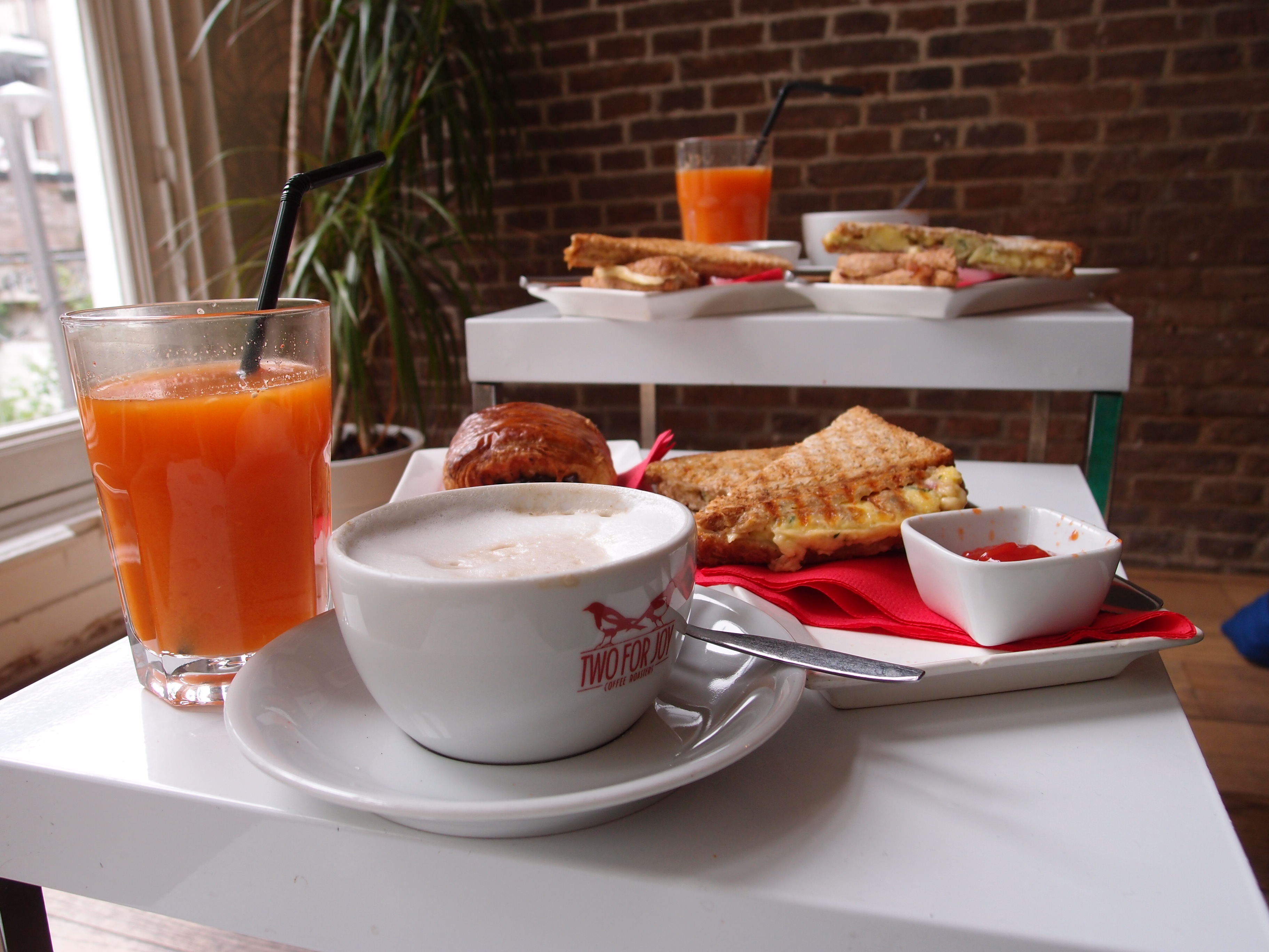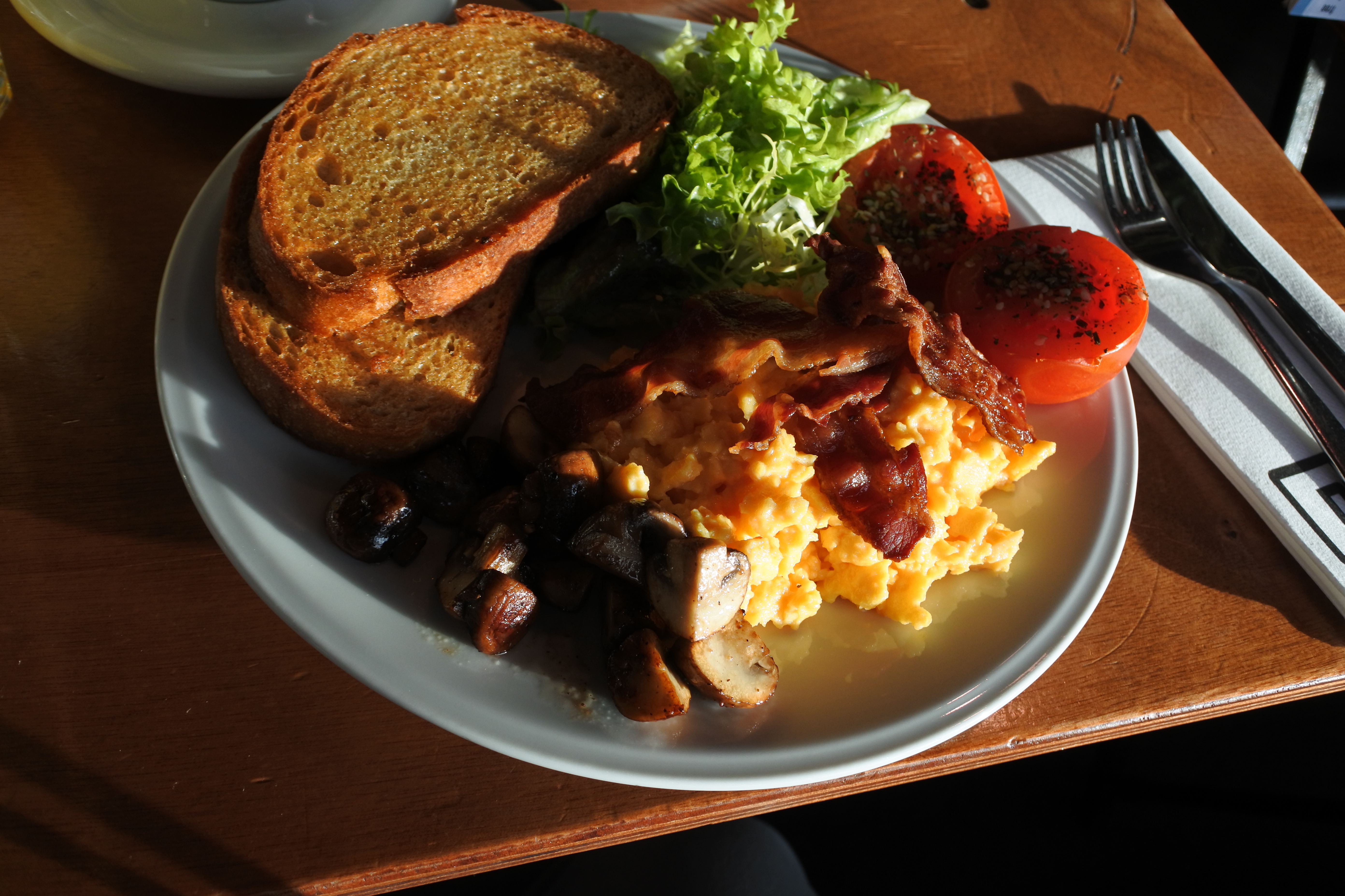 Robin suggereerde dat Stefan de Veggie Cottage Breakfast nam. Hij koos voor gepocheerde eieren, geserveerd met thyme tomaten, champignons, ui, verse kruiden, ingelegde gesneden rode peper geserveerd op volkoren brood, met daarnaast huis gebakken bonen. Hij had ook het grapefruitsap erbij, en 2 americano’s.
