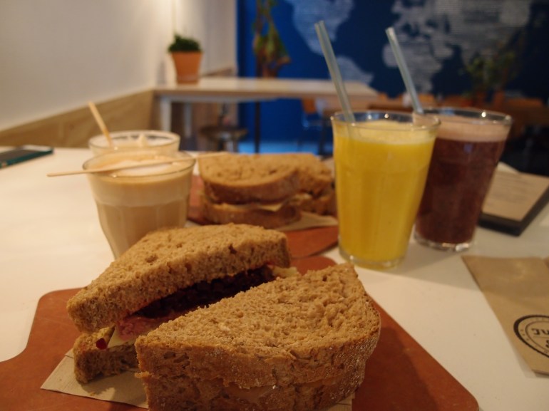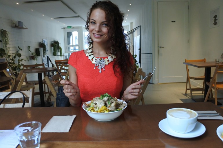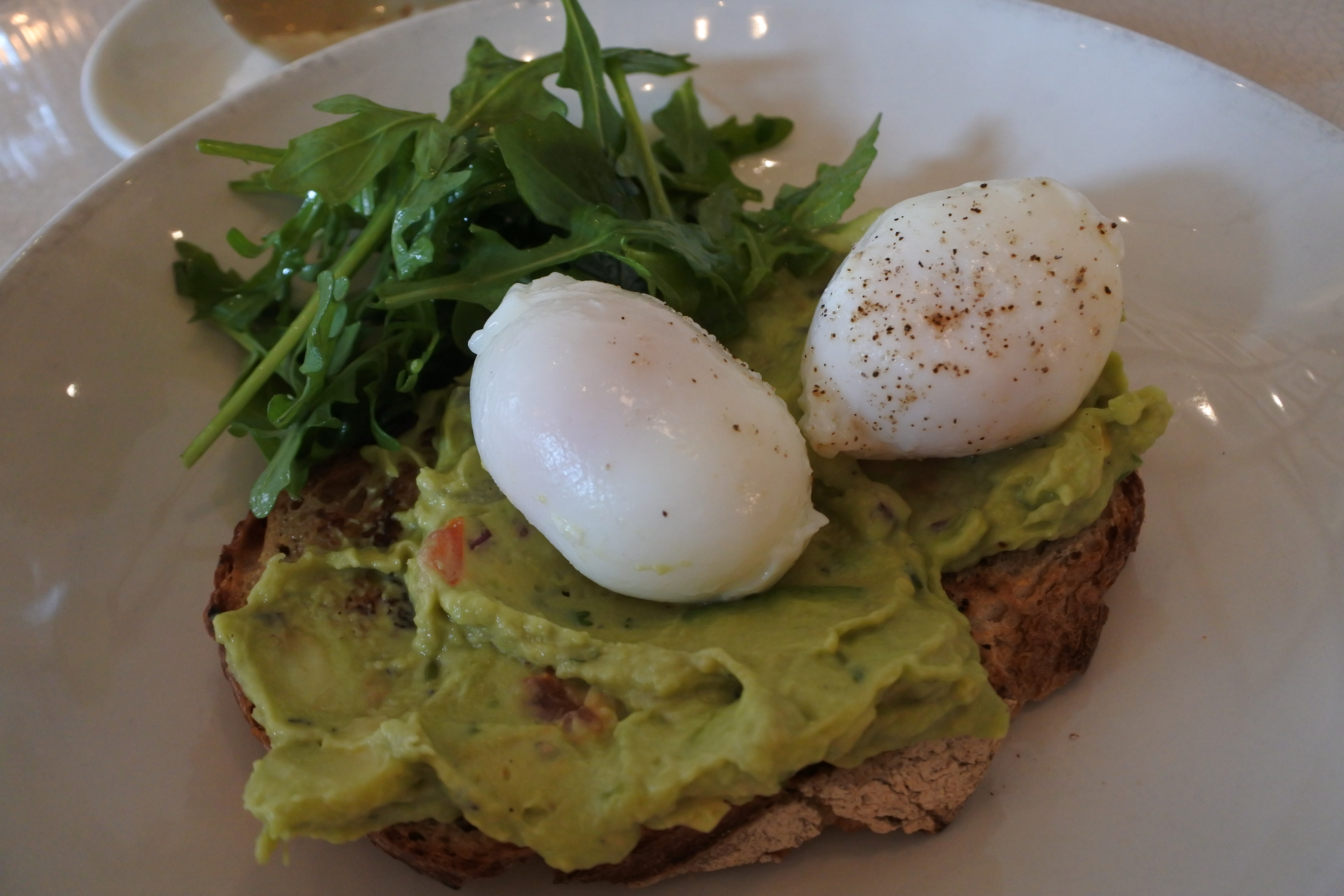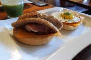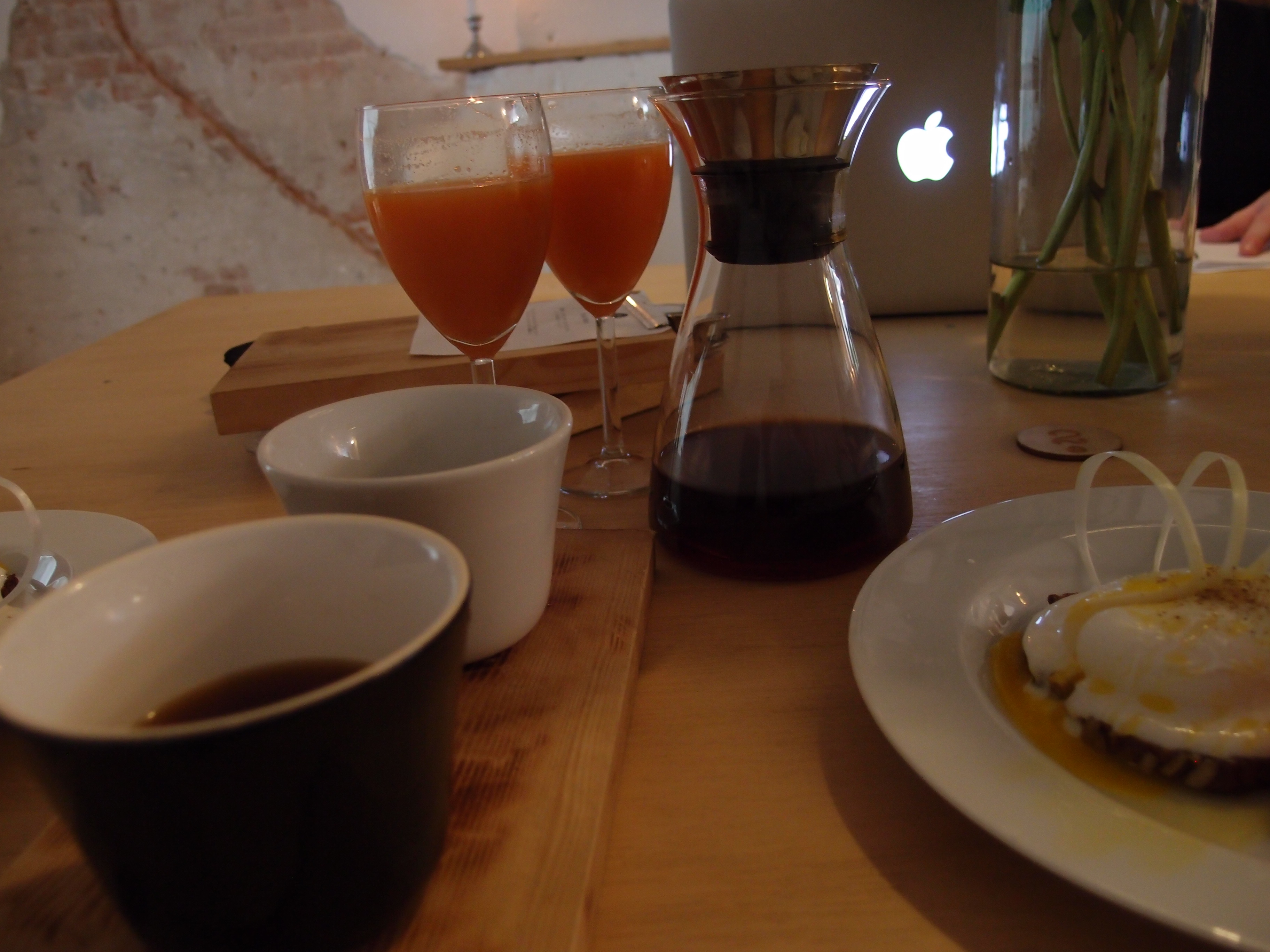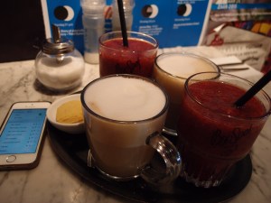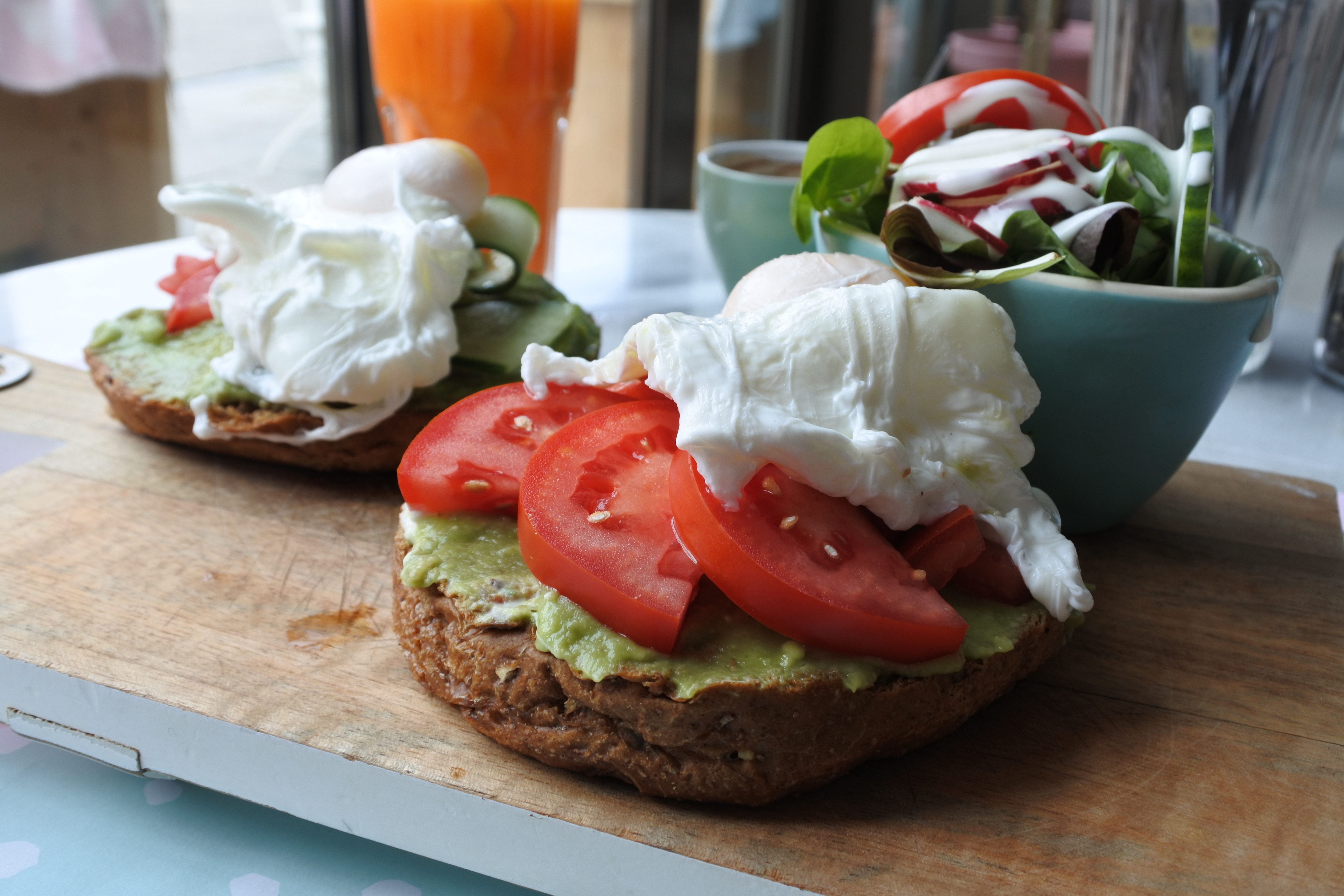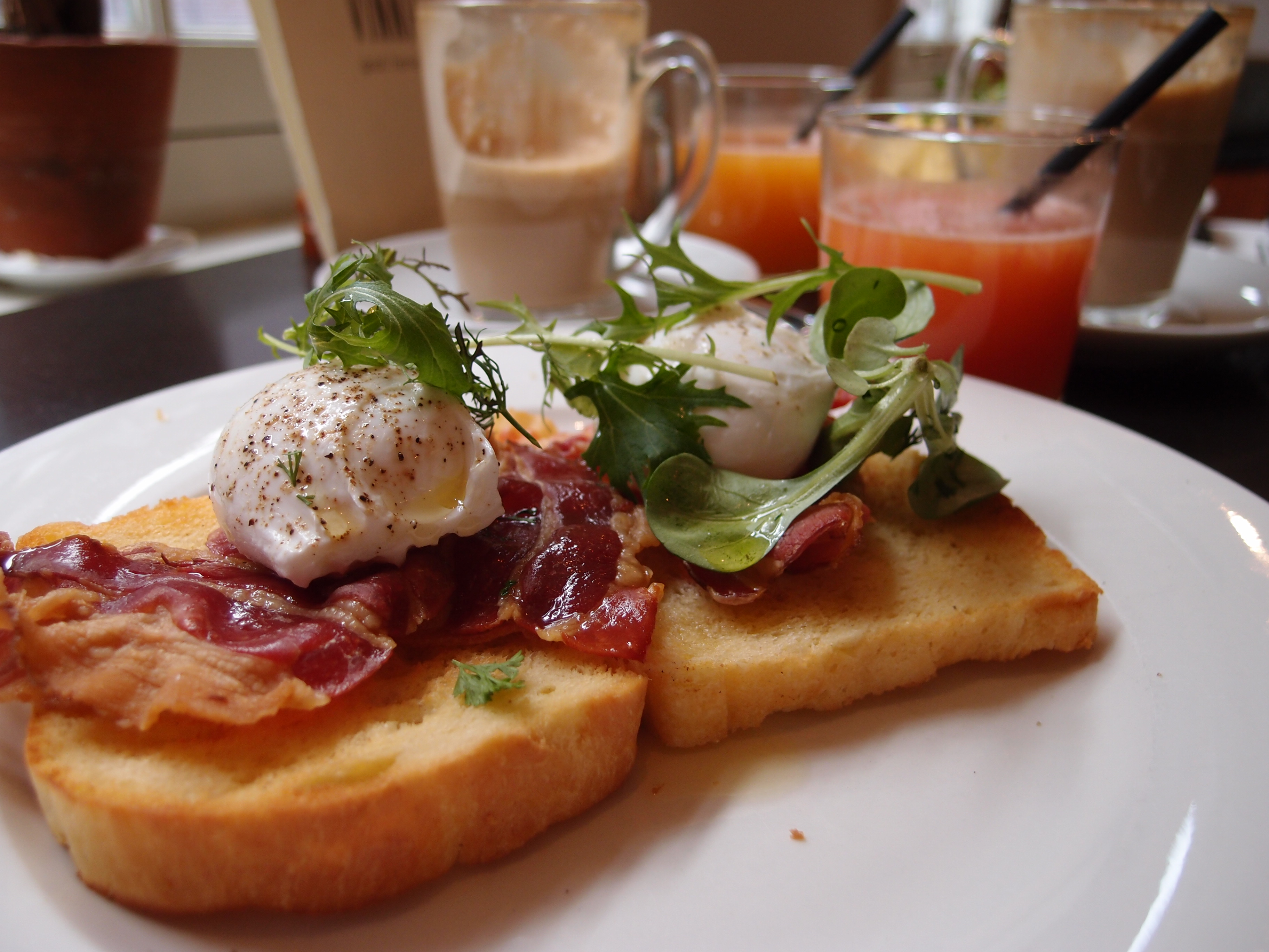 Robin suggereerde dat Stefan de Veggie Cottage Breakfast nam. Hij koos voor gepocheerde eieren, geserveerd met thyme tomaten, champignons, ui, verse kruiden, ingelegde gesneden rode peper geserveerd op volkoren brood, met daarnaast huis gebakken bonen. Hij had ook het grapefruitsap erbij, en 2 americano’s.