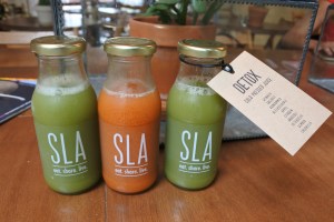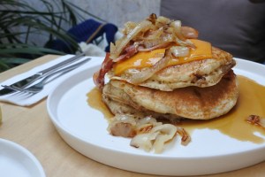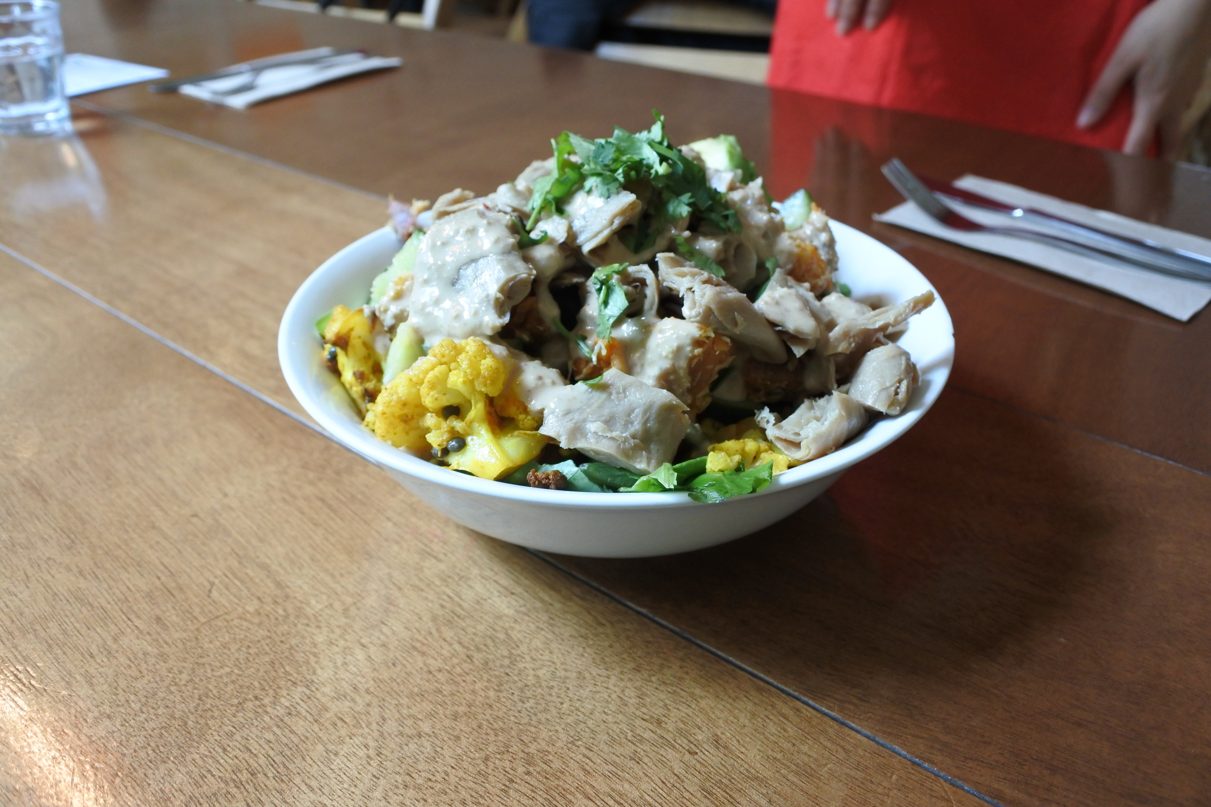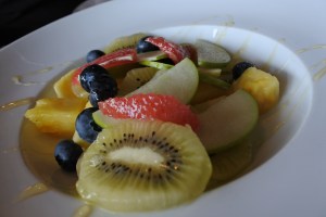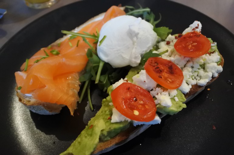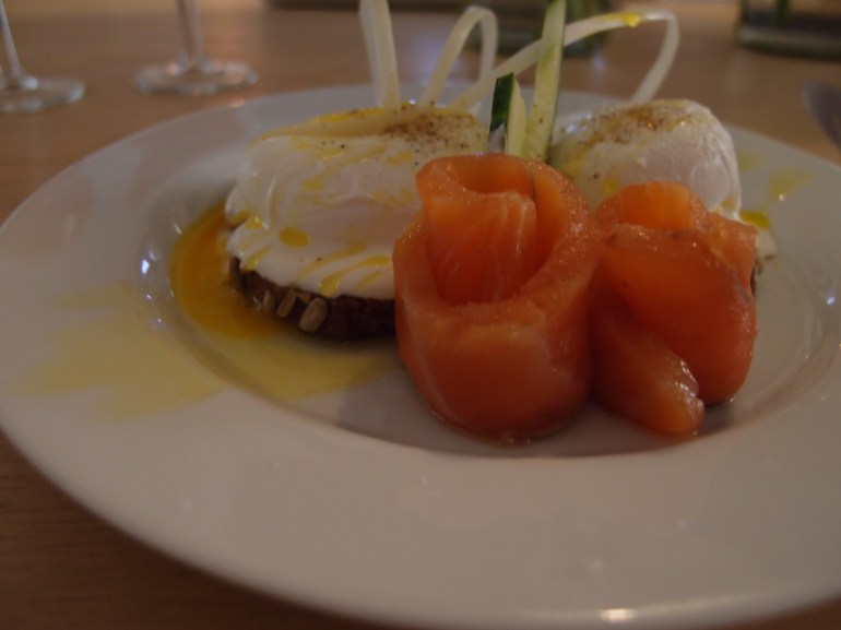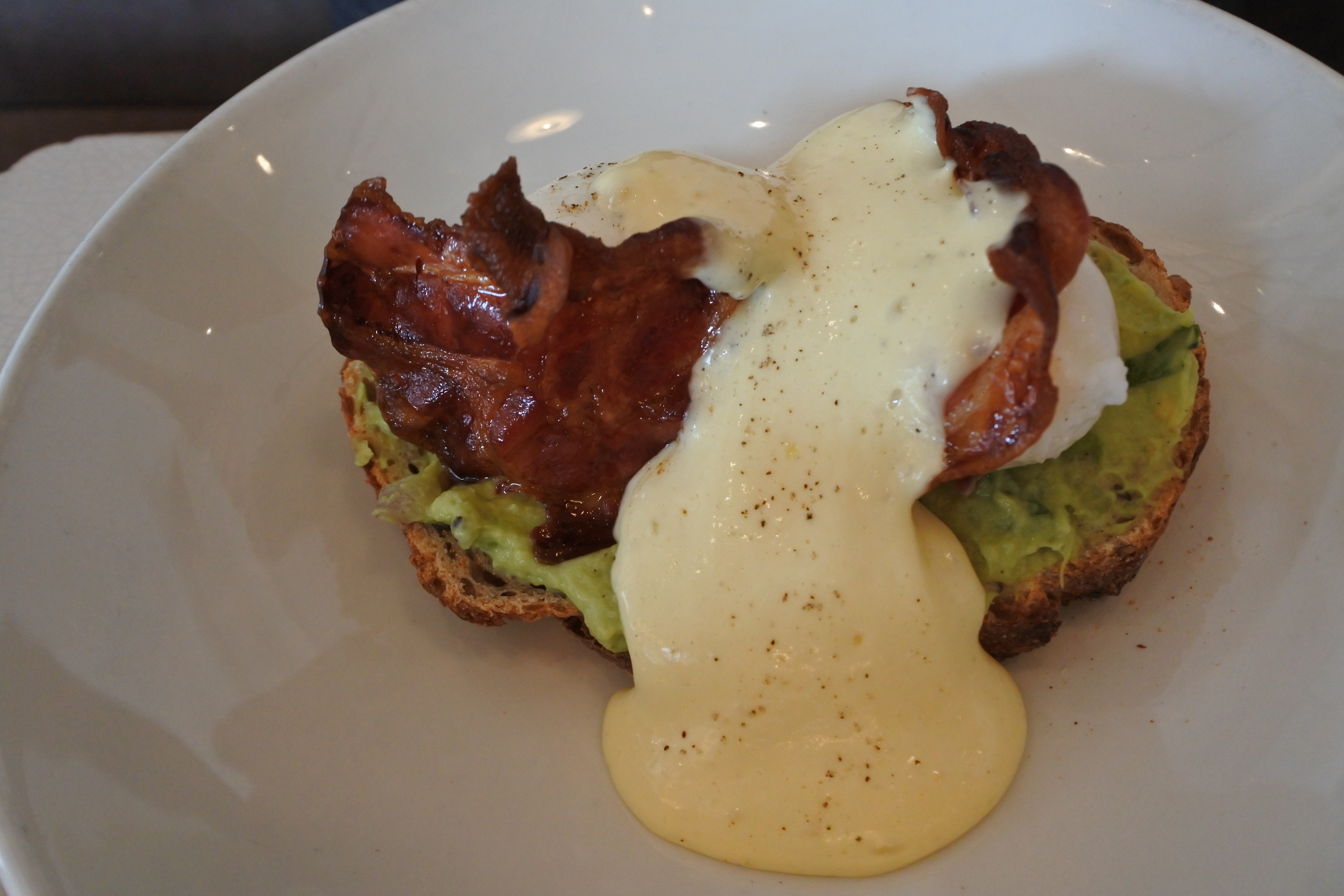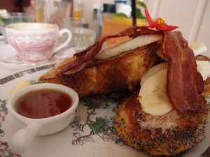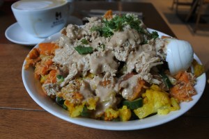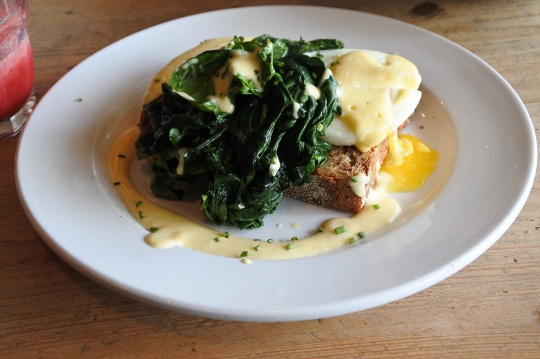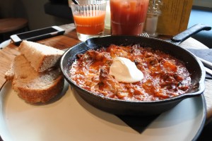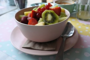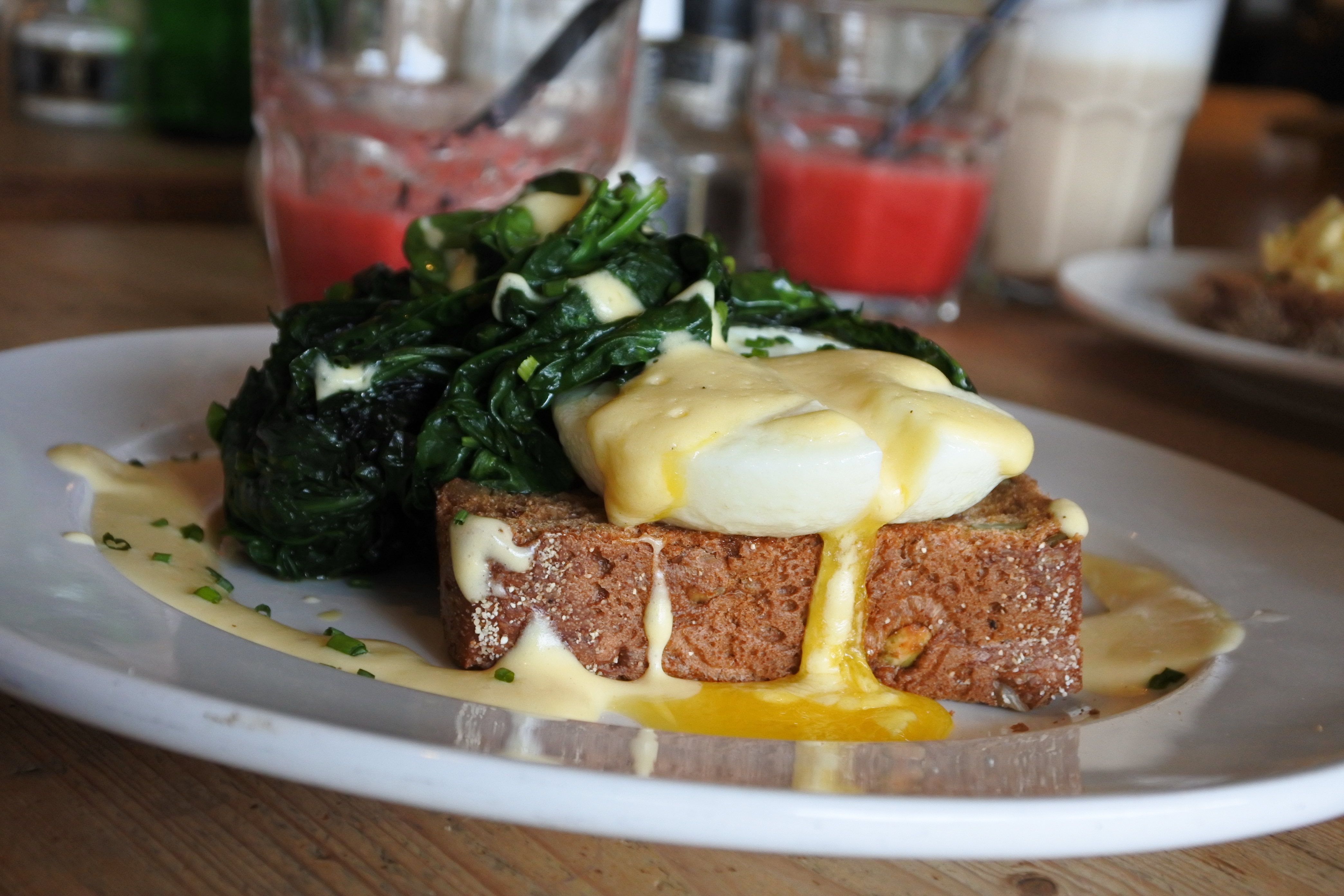 Robin suggereerde dat Stefan de Veggie Cottage Breakfast nam. Hij koos voor gepocheerde eieren, geserveerd met thyme tomaten, champignons, ui, verse kruiden, ingelegde gesneden rode peper geserveerd op volkoren brood, met daarnaast huis gebakken bonen. Hij had ook het grapefruitsap erbij, en 2 americano’s.