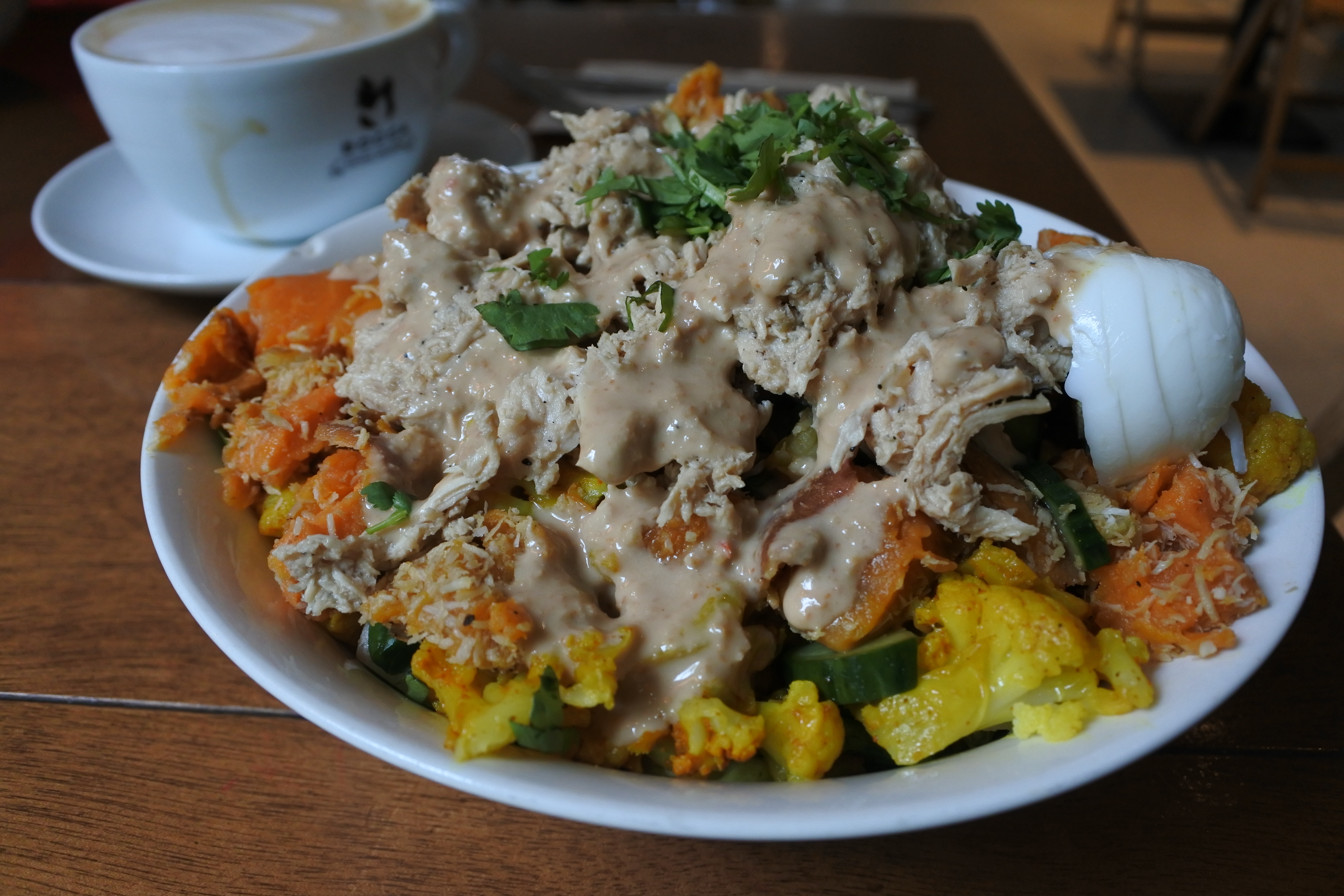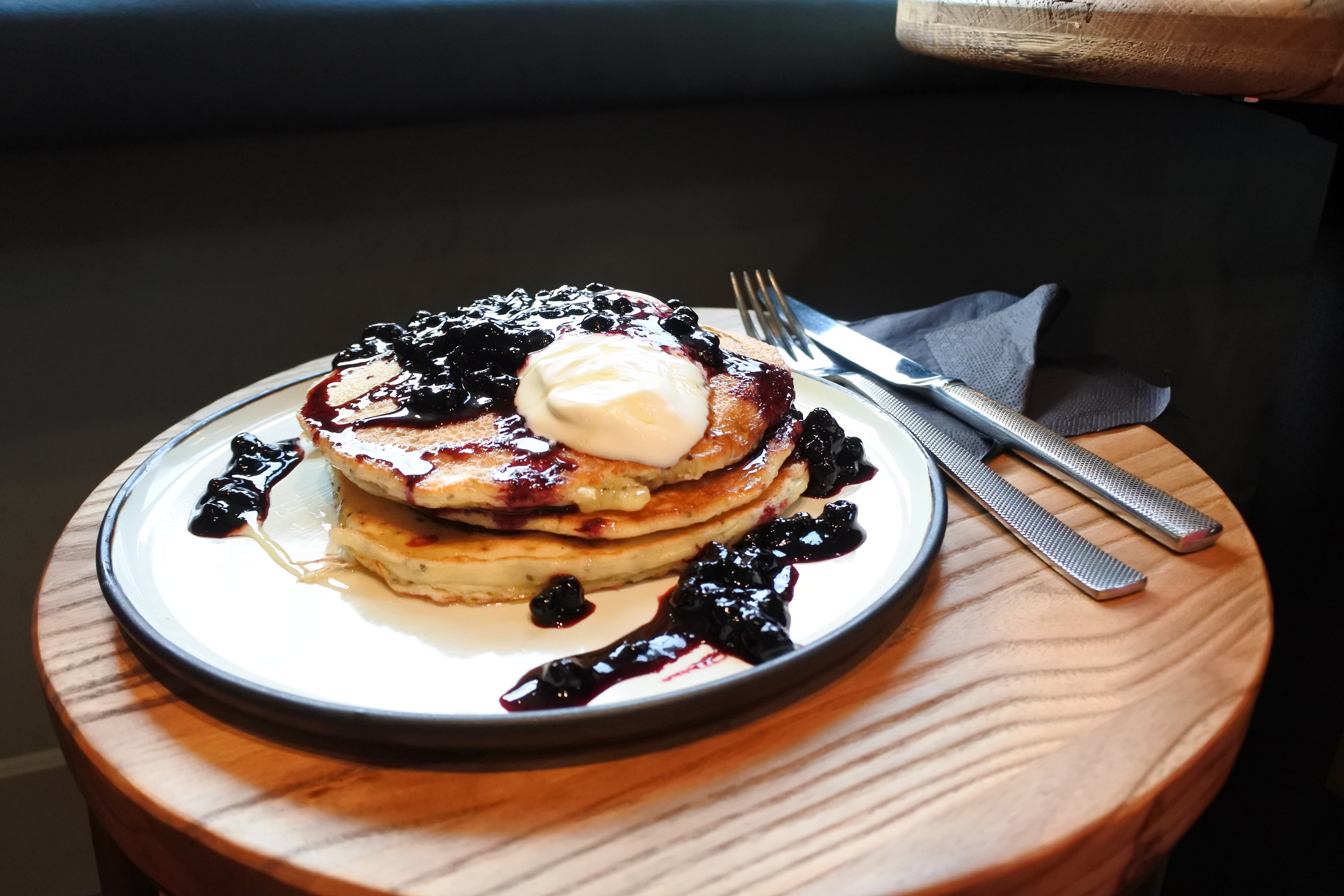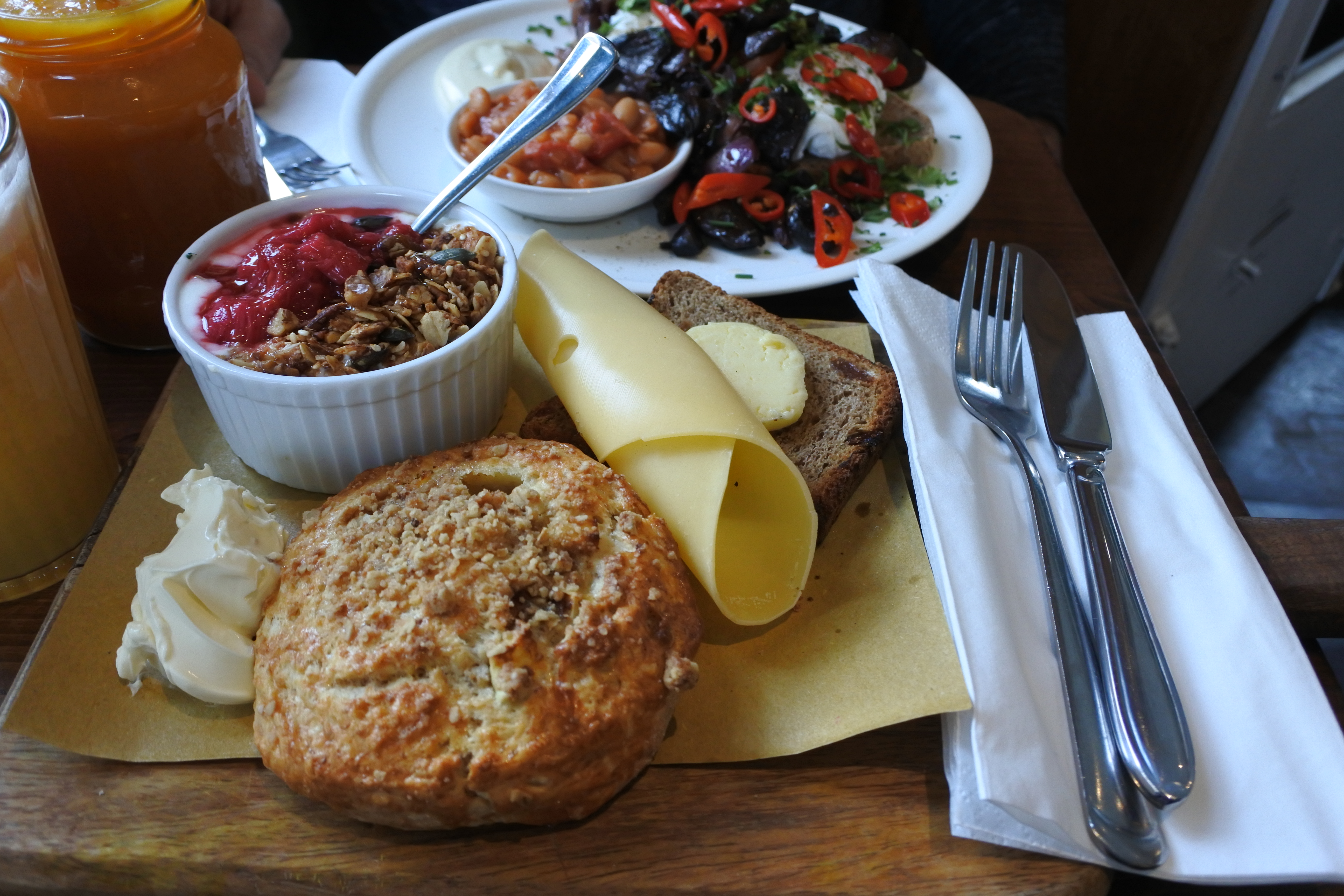 Robin had een cappuccino, een grapefruitsap met gember en lime en de Sweet Cottage Breakfast, bestaande uit een scone, clotted cream, een plak Hartog rozijnenbrood met boter en kaas, huisgemaakte jam en een kleine yoghurt met peer, zwarte bessen en granola. Er waren 2 scones om uit te kiezen: naturel en scone van de dag: apple crumble, Robin koos voor de apple crumble. Er werden ook 2 jams erbij geserveerd, zijn favoriete jam was pompoen, kardemom en sinaasappel; die was verrukkelijk met de scone en clotted cream.