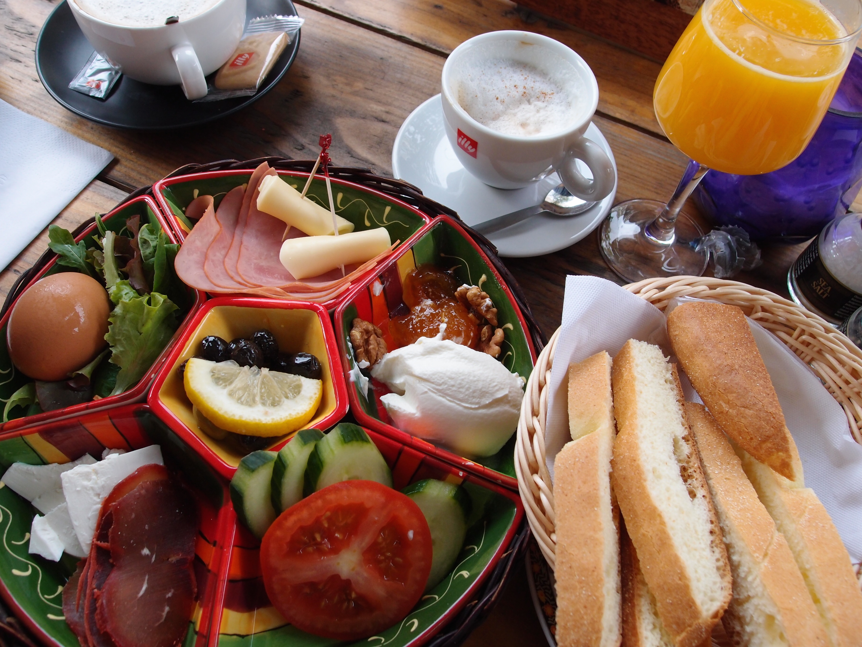 Het sowieso ontbijt van € 7,50 was verrassend, een lekker turks ontbijt met olijven, pastrami met feta, turkse yoghurt met confituur, 2 plakjes kaas met Turkse ham, komkommer met tomaat, en een hardgekookt ei. Dit werd geserveerd met brood. Het zag er erg gezellig uit. Het jammere was dat het ei steenkoud was, maar de rest maakte dat goed.