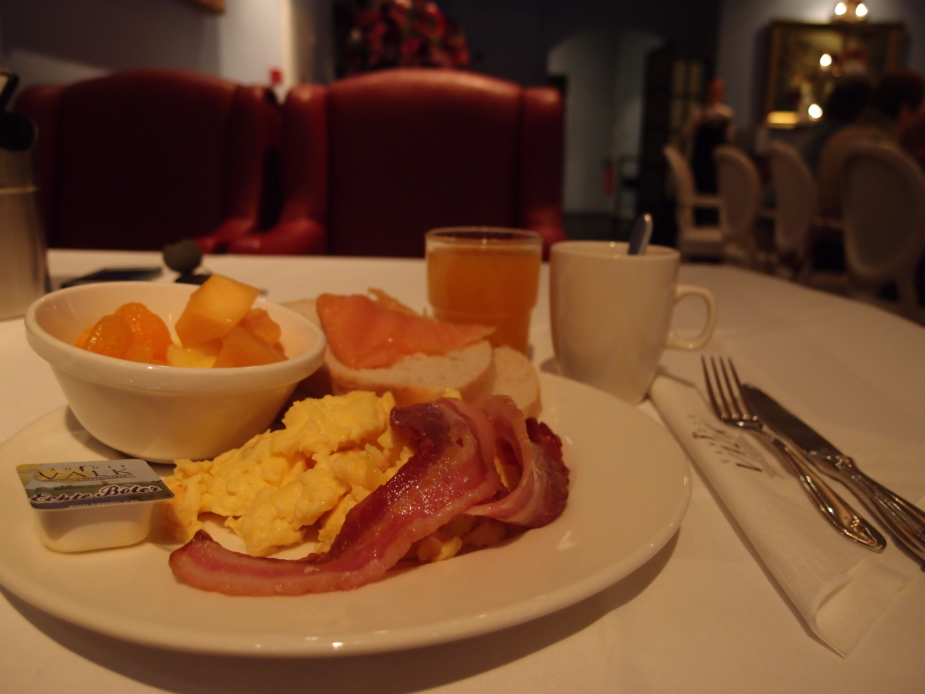 Het is een drukke ochtend en we bevinden ons in internationaal gezelschap in een enorme zaal die we van Van der Valk ook gewend zijn. Met mooi weer kan je ook buiten zitten, maar dat was vandaag niet voor ons weggelegd. Wij mochten plaats nemen in enorme fauteuils aan de zijkant tegen de muur van de zaal. Je hoort nederlands, engels, frans, duits en japans om je heen. Je kan met gevarieerde gezelschappen ontbijten van intieme zitjes tot 4 personen tot lange tafels voor 20 personen.
